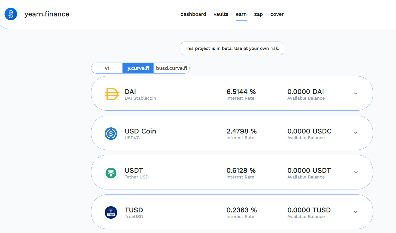 Earn is a key component of the yPool at Curve.Finance, which represents a basket of four yTokens: yDai, yUSDC, yUSDT, and yTUSD. The underlying four yTokens are constantly optimizing to yield the highest available interest in the market (described above), while also serving as a liquidity pool for these tokens. Users can interact with this pool to swap between any of the four tokens with little slippage. Therefore, liquidity providers of the yPool receive the optimized interest rates on their stablecoin deposits and trading fees from users swapping tokens from the pool.