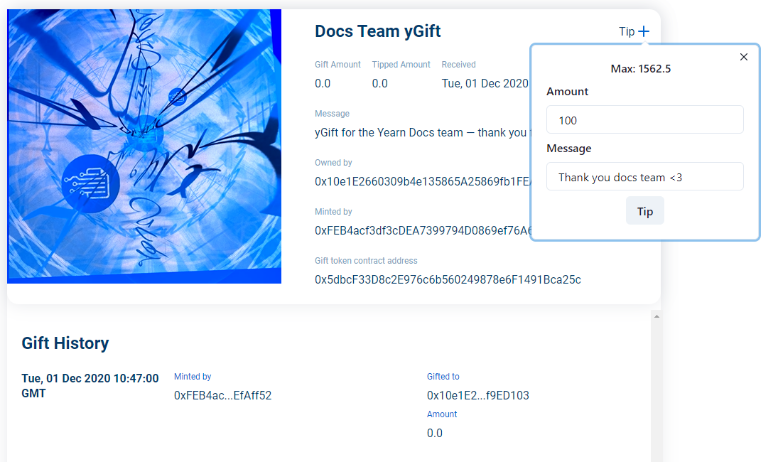 After a yGift has been sent, people can add more funds to it by tipping it! Are you feeling generous? Tip contributor's gift and share some love!