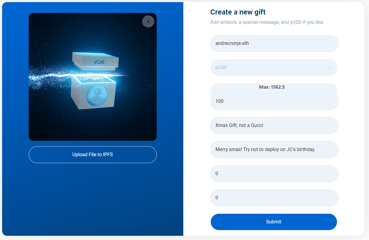 yGift is a Yearn project built by the community, for the community! Want to be part of it? Check out yGift Github and yGift Discord and share your ideas!