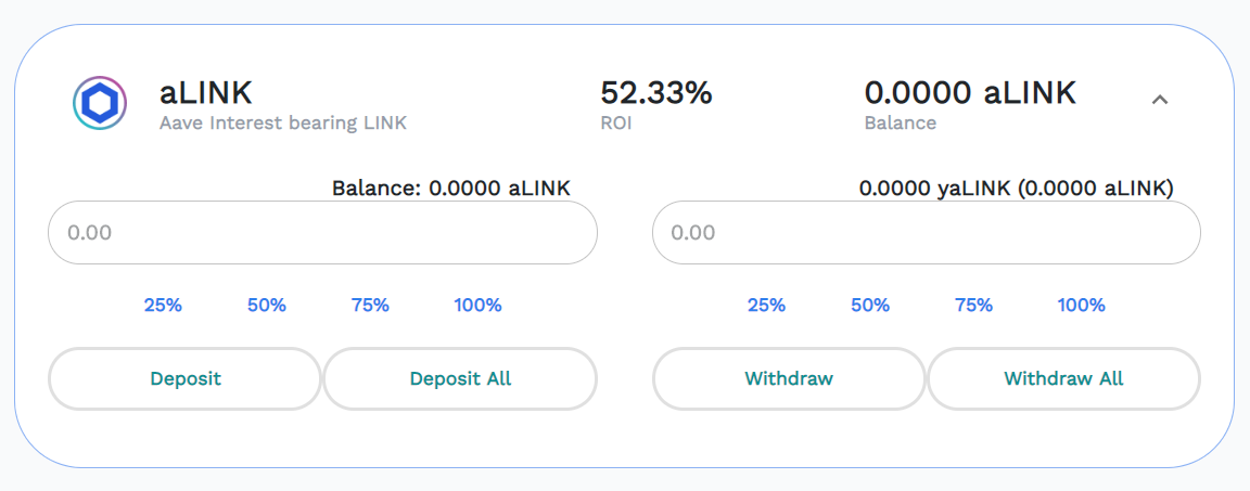 Volatile assets can also particpate in yield farming strategies as part of the delegated yVault product. Currently, there is only one delegated yVault: aLINK.